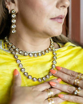 Born from royal roots, this reversible kundan masterpiece is handcrafted with luminous stones framed in gold foil and black enamel. Flip it to reveal a bold, asymmetric meenakari pattern in black and white — a modern art moment that doubles your styling power. Handcrafted in India, designed in California, and styled for life’s runway. Regal meets rebellious, and every angle tells a story.
