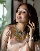Step into luxury with our Nefertiti Medium Bib Necklace in Champagne Bubbles. This exquisite piece features meticulously cut and woven metal scales, offering a fluid, lightweight feel that contours beautifully to your body. The champagne bubbles design adds a touch of sparkle, making it perfect for any occasion. Pair it with bold prints, soft pastels, or elegant neutrals for an instant style upgrade.