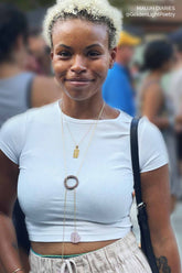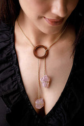 Experience the beauty of nature with the bestselling Isabelle Wood Ring Lariat Necklace. This striking piece combines the rare contrast of dark rosewood against radiant gold, with geometric shapes blending harmoniously with the organic blush pink tones of natural rose quartz stones. Adjustable for versatile styling, this minimalist lariat can be worn at varying lengths, making it a go-to accessory for any occasion. Whether dressed up or down, the evergreen design brings a touch of nature to your look, and you'll find yourself reaching for it again and again.