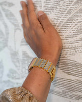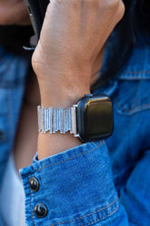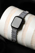 Immerse yourself in the allure of Moonlit Ash – a classy twist on our Eternity Apple Watch® bands. Inspired by vintage baguette rings, this design merges timeless elegance with modern chic. The continuous row of enamel-filled lines, paired with the pearly gray, creates an accessory that effortlessly complements any style, making it a versatile and striking addition to your collection.